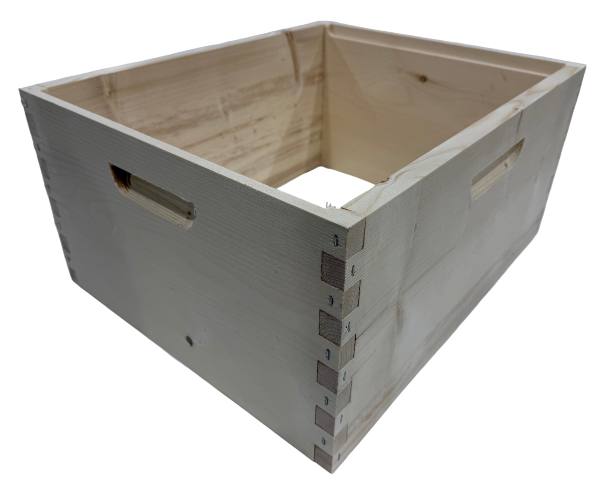 Our commercial grade deep hive bodies are cut with precision, have generous hand holds and a routed out frame ledge for a full and stronger top joint. These are assembled with Titebond 3 and 16ga medium crown staples.